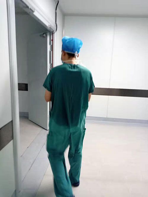 其实魏大夫自己,现在也是一名病人。他正饱受着十二指肠溃疡、胃炎和食管炎带来的痛苦,下夜班后自己输完液体,就走上了另一个“战场”。在我们医院,汗透“医背”,是许多手术中的“标配”画面。每一次体力和耐力的考验,大多会让医护人员后背湿透,他们自己却习以为常,当作是“家常便饭”。