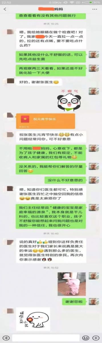 元宵节前夕,张大夫回答完家属健康保健问题后,患儿母亲心怀感激,为表示感谢向张大夫发送了微信红包,张大夫回复道:您的心意我收下了,感谢您对我们儿科的信任,红包我绝对不能收。张春惠主任经常教导我们说“宝宝的健康是家庭幸福的源泉,为孩子的健康服务我们义不容辞”,这些都是我们应该做的。家属听后再次向张欣慰大夫表示感谢,并对我们医院,对儿科赞不绝口。