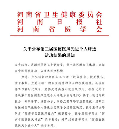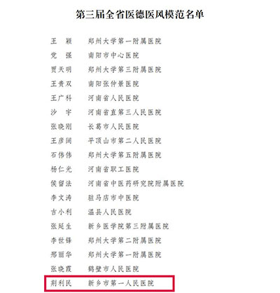 我院CT室主任荆利民通过组织推介、专家评审、媒体公示、网络点赞等环节层层选拔,经第三届医德医风先进个人评选活动领导小组研究决定,最终被授予“河南省医德医风模范”荣誉称号。