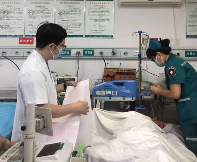 司机驾驶急救车争分夺秒,将患者安全送至抢救室,早已待命的抢救组护士芦永霞、张亚茹迅速接手继续抢救,为保障患者循环张主任立即给予锁骨下中心静脉置管,约15分钟后,患者生命体征趋于稳定转入EICU继续治疗, 目前患者神志已转清。